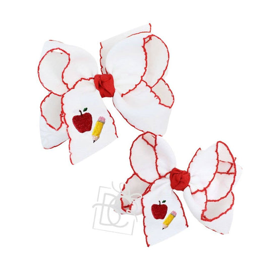 Embroidered Pencil & Apple on Crochet Edge Bow: 4.5" Large