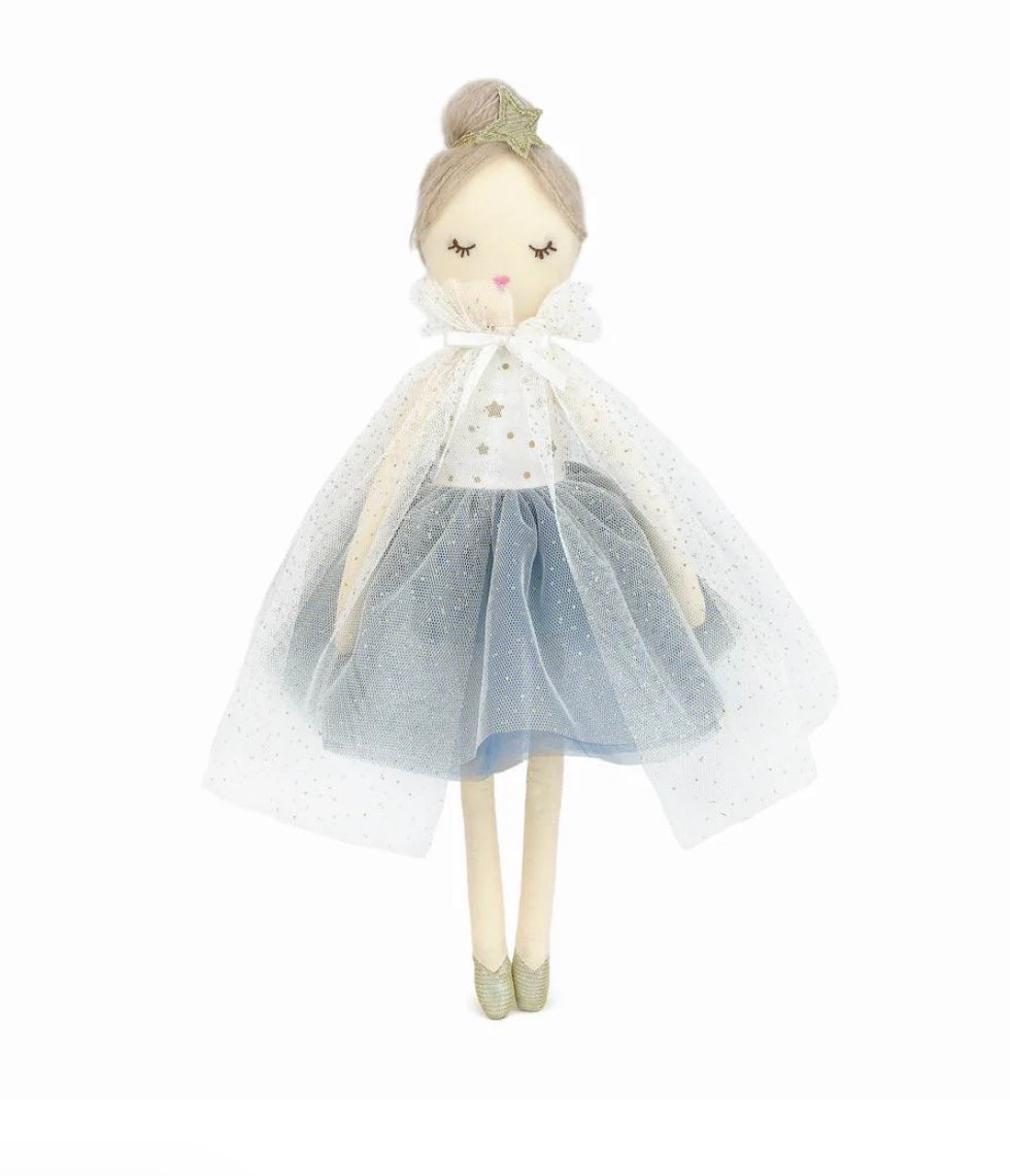 There is a new royal to watch. Mon Ami??s Princess Estelle soft doll exudes elegance and grace in her snow white and cornflower blue tulle dress, festooned with a crisp bow. Of course, our princess plush doll wears gold slippers that are as fabulous as she is. This sophisticated soft doll is also easy to snuggle, whether a trip to the museum or movie night is on her busy agenda. An exquisite chignon and beautifully embroidered face makes our princess plush doll first in line for winning hearts.