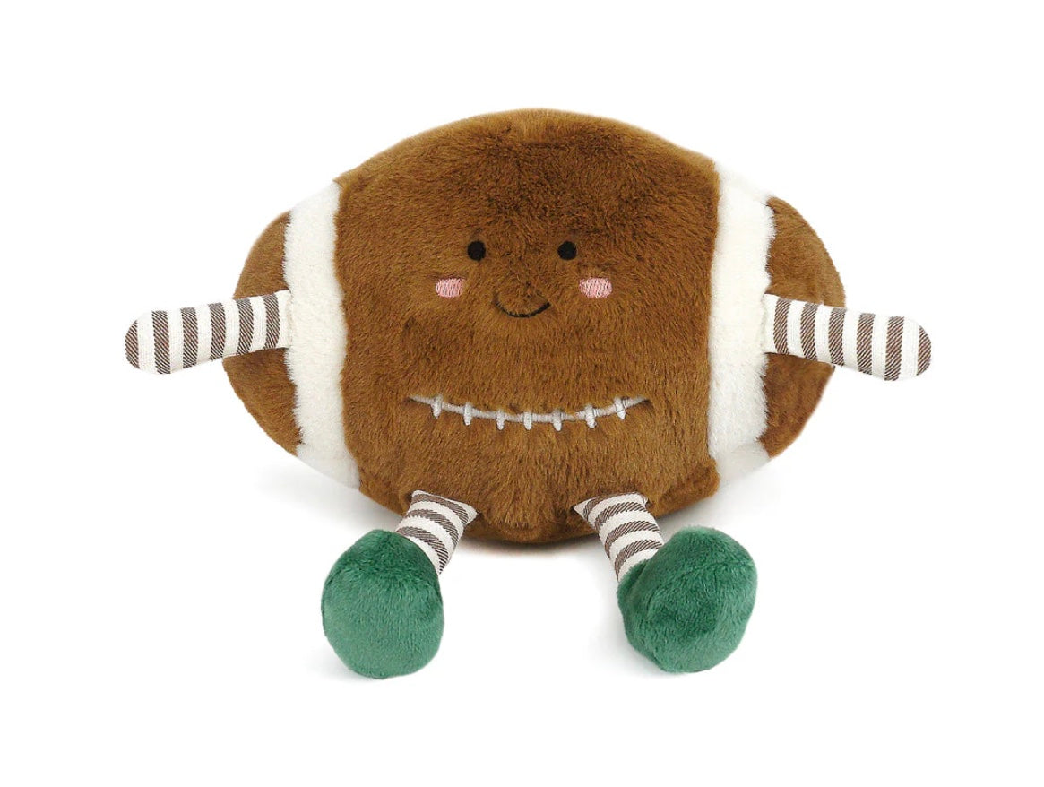 Meet Freddie Football, the cuddliest MVP of the game! With his super soft, textured brown fur and signature white stitching, Freddie puts a snuggly spin on classic football fun. His cheerful embroidered face, complete with rosy cheeks, brings playful charm, while his striped arms and legs, topped with green plush sneakers, have him ready to score big in both playtime and snuggle time. Whether he's the star of an imaginary touchdown or a cozy cuddle buddy, Freddie Football is the perfect teammate for any little athlete's plush collection.