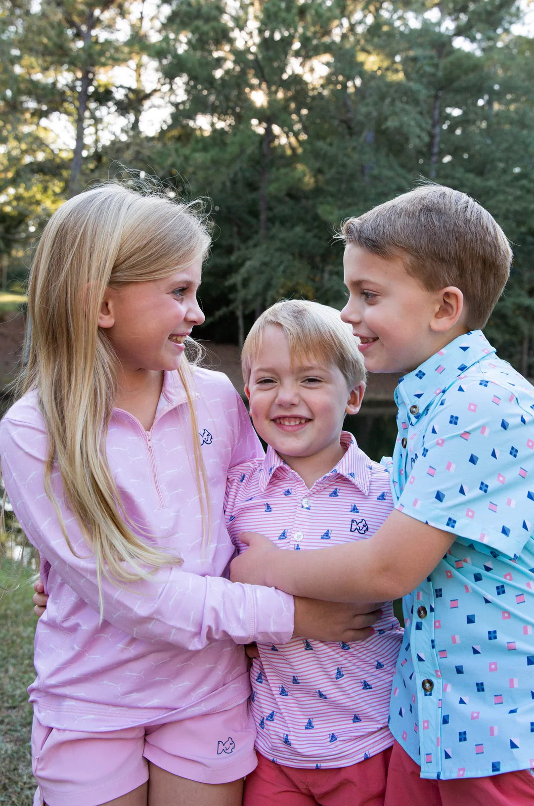 No matter the adventure, your boys will be ready in these fast-drying, UV-protective, boys' short-sleeve pro performance polo shirts in Fishing Boat Print on Spiced Coral Stripe. Our boys' polos keep moisture out with wicking technology, breathable fabric, and the signature vented back. PRODOH polo shirts are perfect for golf, tennis, country clubbing, or cruising the coast. Youth polos come in stripe and new pattern prints and are available in sizes 12 month - youth large 12/14. Pair with our Outrigger Short.