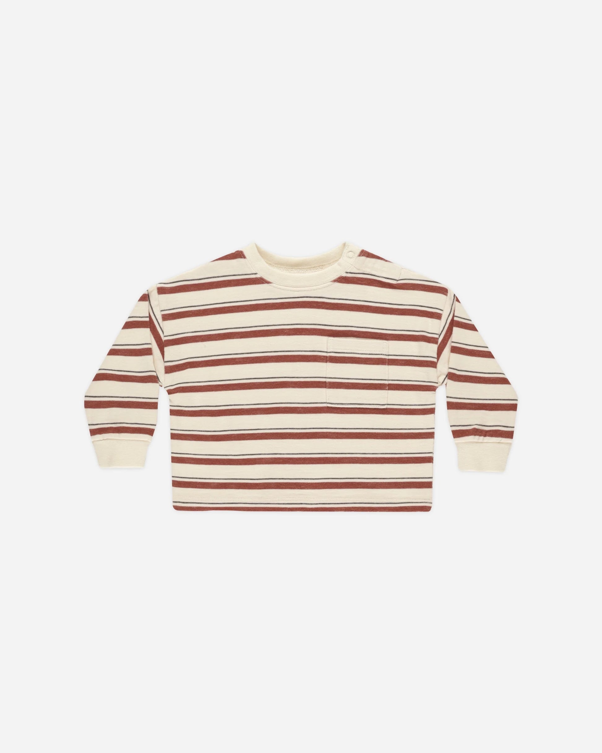 Relaxed fit long sleeve tee with contrast ribbing at the neck and sleeve openings. Baby sizes 0-3m thru 6-12m have snaps at the shoulder for easy changing.